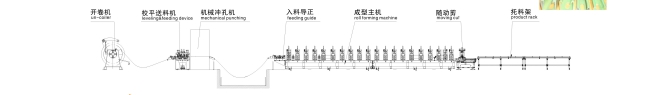 上料平臺—開卷機—伺服送料—沖孔沖壓—輥壓成型—切斷—翻轉送料