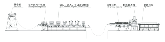 通過切換可生產50多種規格型號門板,更換板型快捷方便,一人即可操作整線。PLC集中控制整線的開卷、校平送料、定長沖孔、沖缺口、壓凸點、剪切翻邊、輥壓成型、自動卸料,可一次設定多組制件數據任務,自動化生產,可遙控控制。